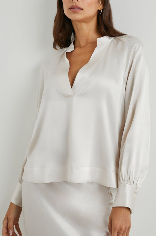 A classic blouse with elevated details, the Wynna is sure to be a go-to in your repertoire. Made from satin back crepe, it moves and shines with you. Complete with long sleeves, a v-neckline, and ruching at the sleeves and back.