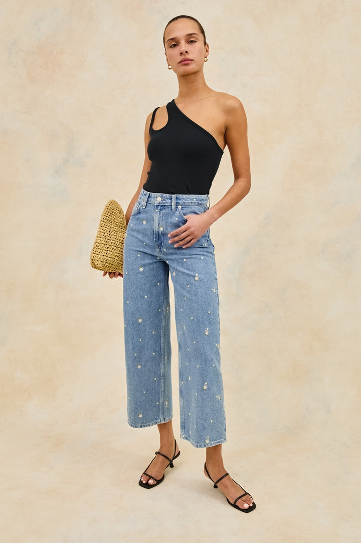 GETTY CROP WIDE LEG - INDIGO FLORAL Getty cropped wide leg jean with Indigo Floral detailed embroidery - stylized full body front view on model