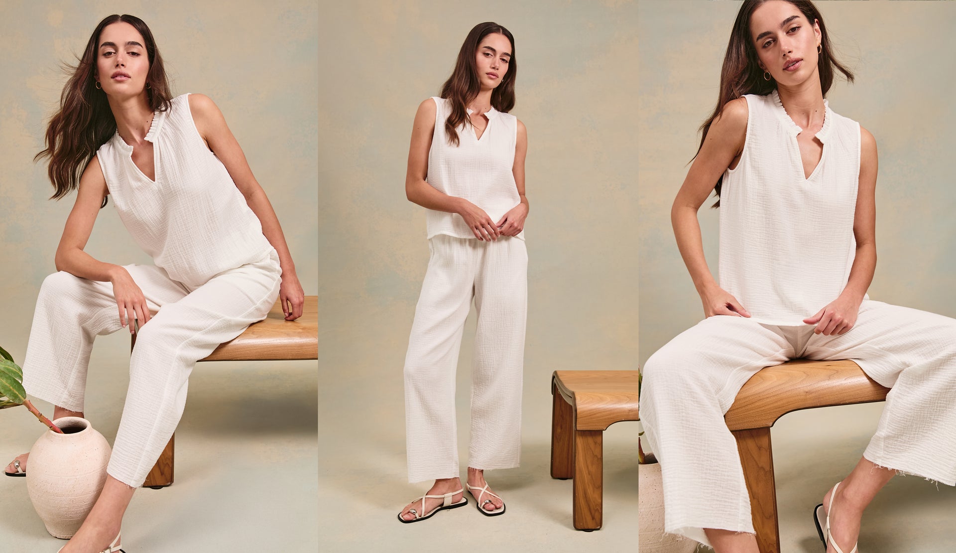 Three images of a woman wearing a white sweater and brown pants against a beige background. Three images of a woman wearing a white sweater and brown pants against a beige background. Three images of a woman wearing a white sweater and brown pants against a beige background.
