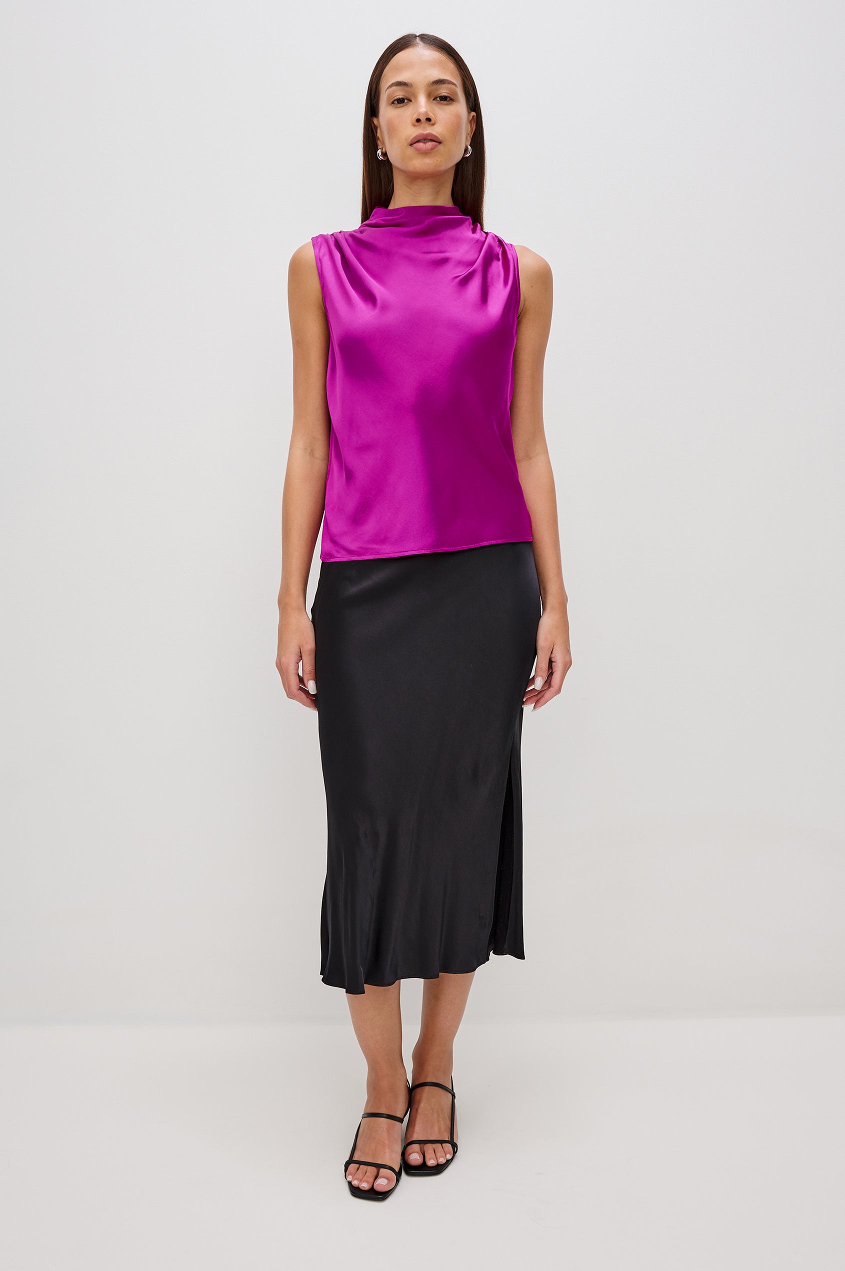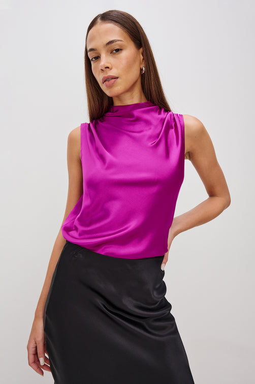 The Kaleen Top is a contemporary tank crafted from smooth, satin back crepe. It features a draped mock neck and fluid silhouette with a traditional camisole fit.