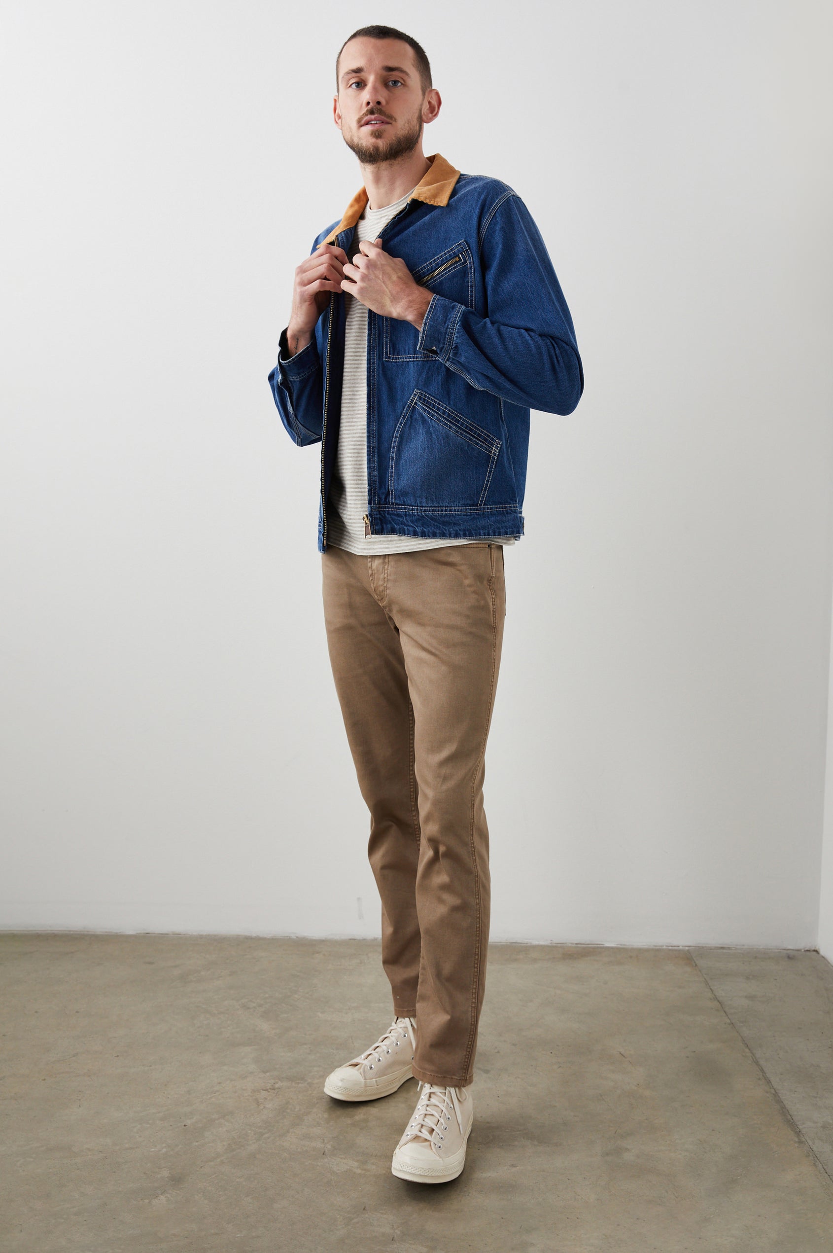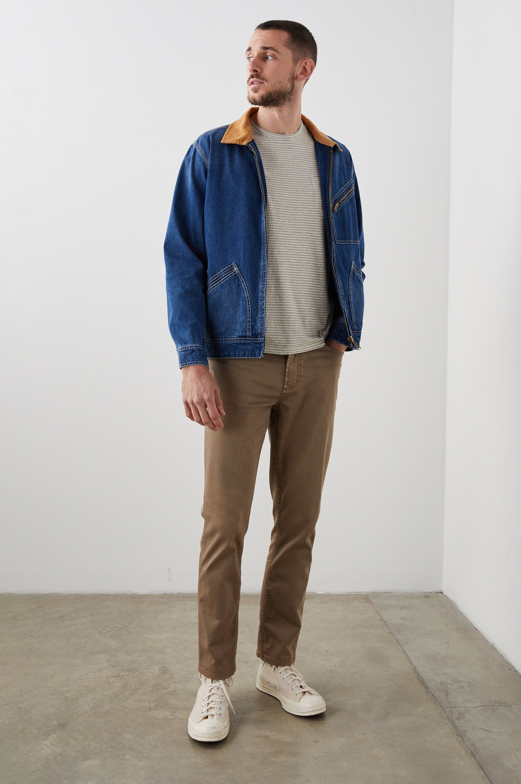 This vintage-inspired jacket is both a staple and a statement piece. Crafted from rugged cotton hemp canvas with a contrast corduroy collar, this style fuses form and function seamlessly. With a classic trucker jacket fit this statement piece is perfect for both outdoor excursions or urban explorations.