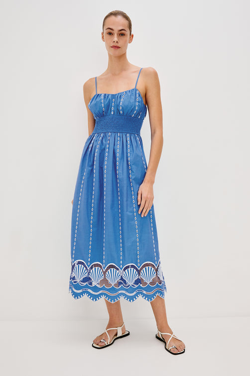 The Murano is a dreamy maxi dress in cotton poplin, featuring an A-line fit with elastic shirring at the waist. Coastal cues include shell embroidery and a scalloped hem.